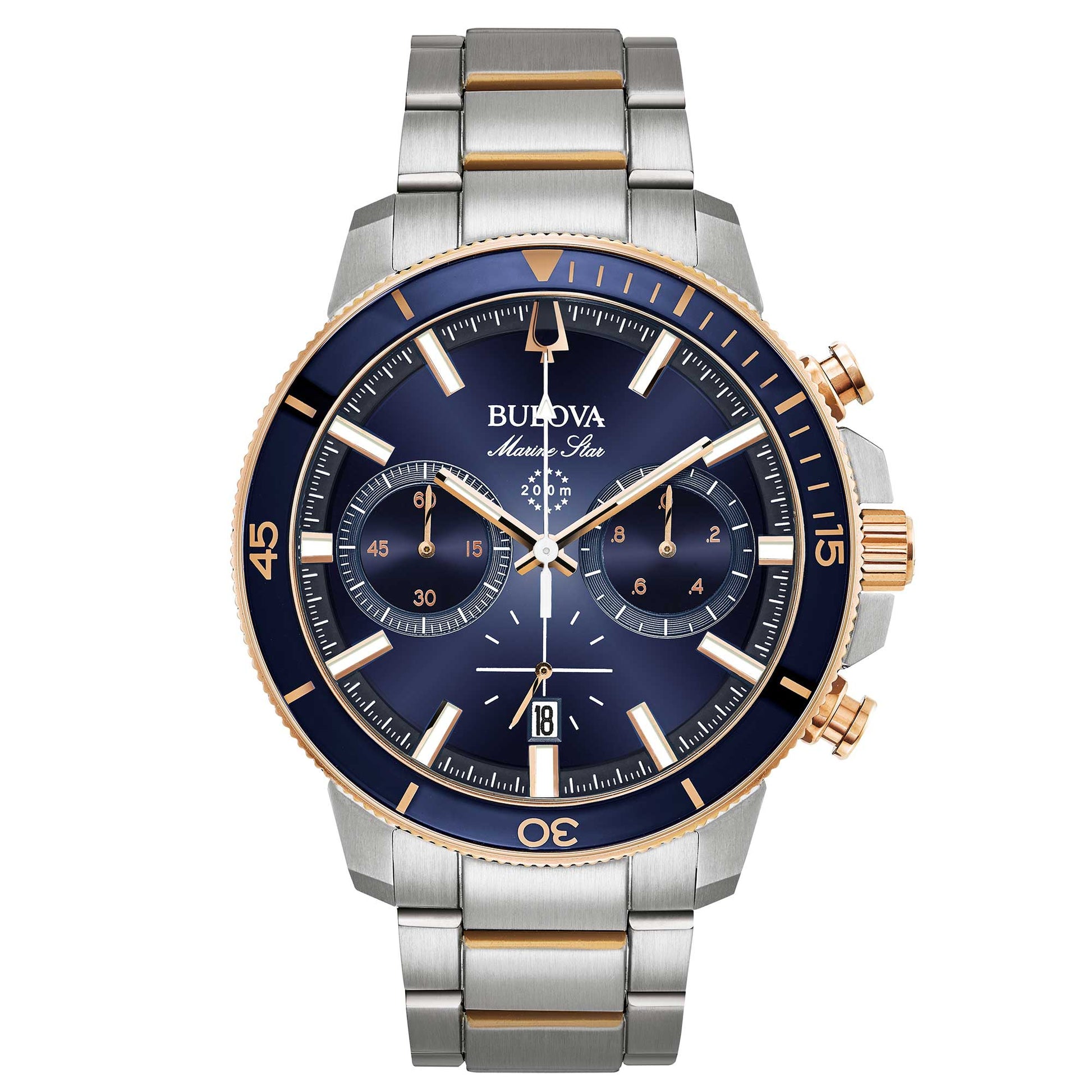 Il Bulova Marine Star Crono 98B301 unisce precisione e robustezza grazie al movimento al quarzo con funzione cronografo. La cassa in acciaio placcato oro rosa da 45 mm, dotata di ghiera girevole unidirezionale e fondello a vite, garantisce resistenza fino a 20 atmosfere. Il quadrante analogico blu, protetto da vetro minerale, si abbina al bracciale in acciaio con fibbia deployante e chiusura di sicurezza, offrendo comfort e sicurezza durante l’uso quotidiano e in immersione. Un orologio tecnico e raffinato, ideale per chi cerca affidabilità e stile.