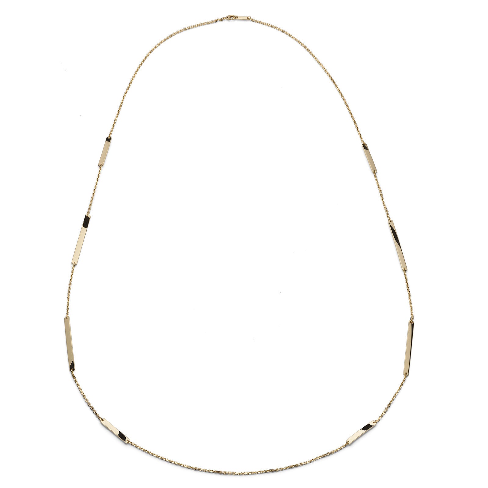 La collana Lux dorata presenta una raffinata catena sottile con lastrine rettangolari piatte alternate, per un design elegante e moderno. La chiusura a moschettone garantisce sicurezza e praticità, mentre la lunghezza di 123 cm permette di indossarla sia lunga che a doppio giro. Perfetta per valorizzare anche i look più semplici, si abbina con facilità ai gioielli coordinati della collezione Lux, aggiungendo un tocco di luce e stile in ogni occasione.